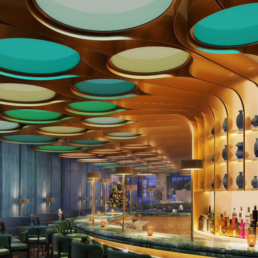 A design tour-de-force defined by a vibrant feature ceiling that brings Marylebone flair. The elegance and individuality of a teal marble bar speak of Mayfair chic.