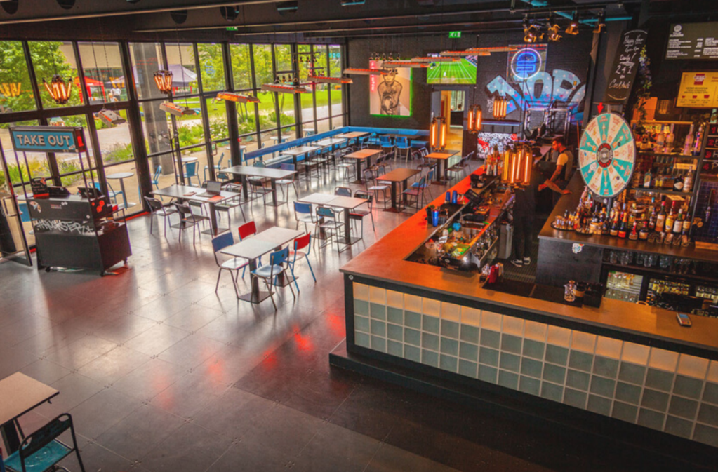 Opposite the bar are two basketball shoot out mini courts, but these are reserved for the office staff.